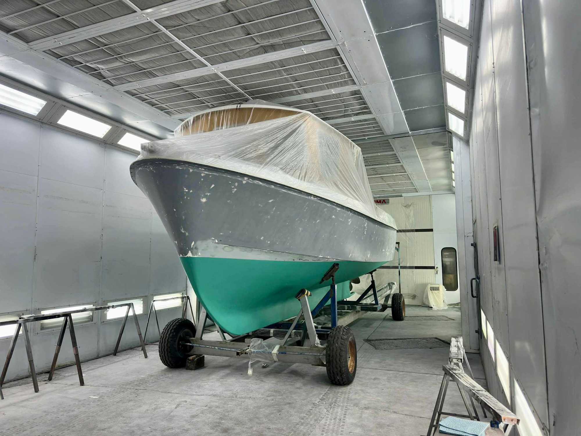 The Aranycsillag, the prestigious motorboat of the Balatonfüred Yacht Club, stands on the threshold of renewal. After meticulous preparation, it now awaits its final priming in the paint chamber — the last step before it can once again serve the sailing life of Lake Balaton in its full glory. This moment marks a ceremonial milestone in a long restoration process, opening a new chapter in the story of the Aranycsillag.