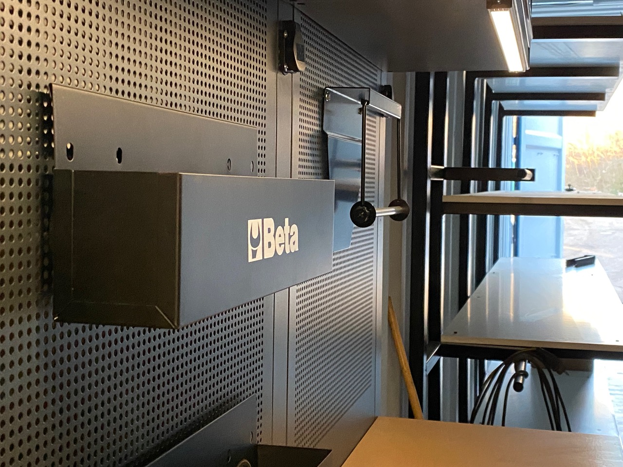 The interior is meticulously designed, featuring modern tool and storage systems that enable mechanics to work efficiently. Equipped with Beta tools, a spacious workbench, and well-planned lighting, the workshop ensures that boats are prepared at the highest standard.